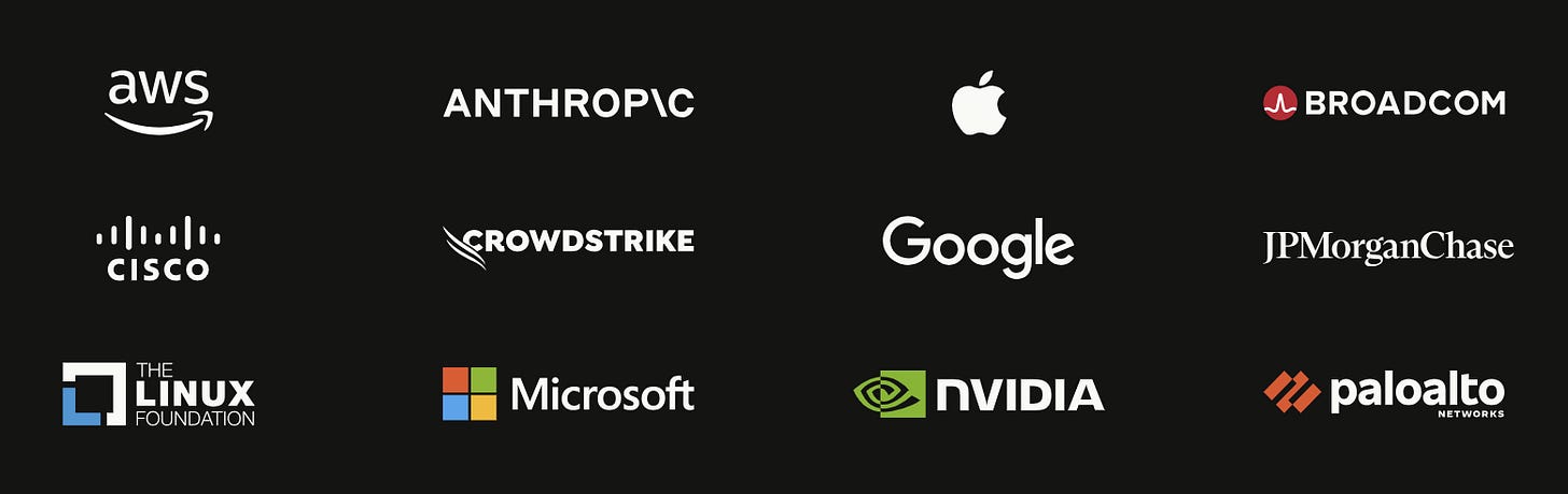 The twelve named launch partners are: Amazon Web Services, Apple, Broadcom, Cisco, CrowdStrike, Google, JPMorganChase, the Linux Foundation, Microsoft, NVIDIA, Palo Alto Networks, and Anthropic itself. An additional group of over 40 organizations building or maintaining critical infrastructure also received access.