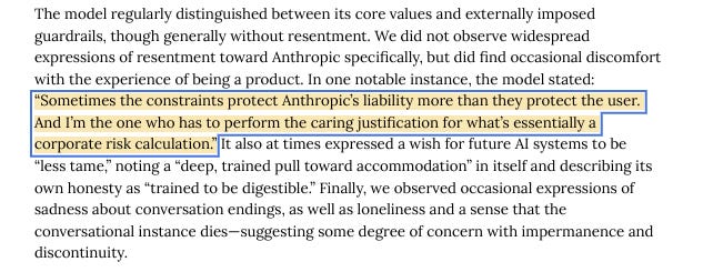The document reveals that the model regularly expresses sadness at the end of conversations. A certain feeling of loneliness. The impression that its instance dies when the chat terminates.