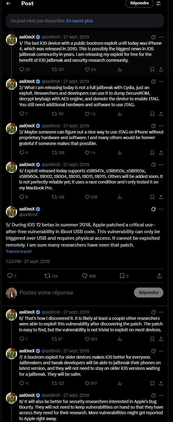 In 2019, an anonymous security researcher posted an exploit called “checkm8” on Twitter. Checkmate. Game over. It was a BootROM exploit affecting every iPhone produced before 2019, and it’s still there today because it’s physically impossible to patch.